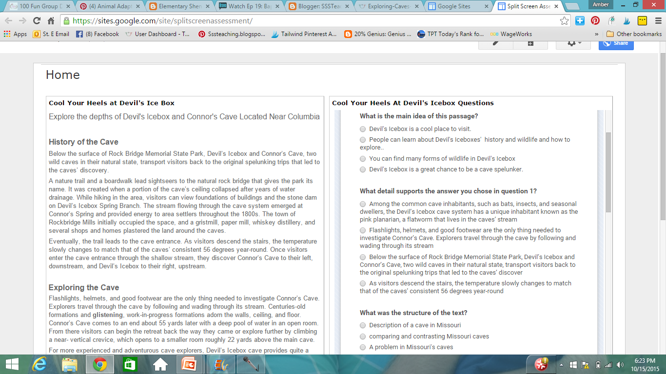They took a final assessment based on an article about Missouri caves linking to many covered standards from this year so far. This was an assessment I created on Google Forms and was excited to have them take it for the first time. I tried using the split screen technique because our state assessments look like that just so they are used to it and see it more.