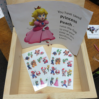 The Breakout box will contain our Mario flag that the first group will get to raise and the save Princess Peach sign. It will also have some Mario tattoos for us to wear in celebration! I did print out small flags to write our names on and put in the hallway as well. I plan to play Mario music while they are working.